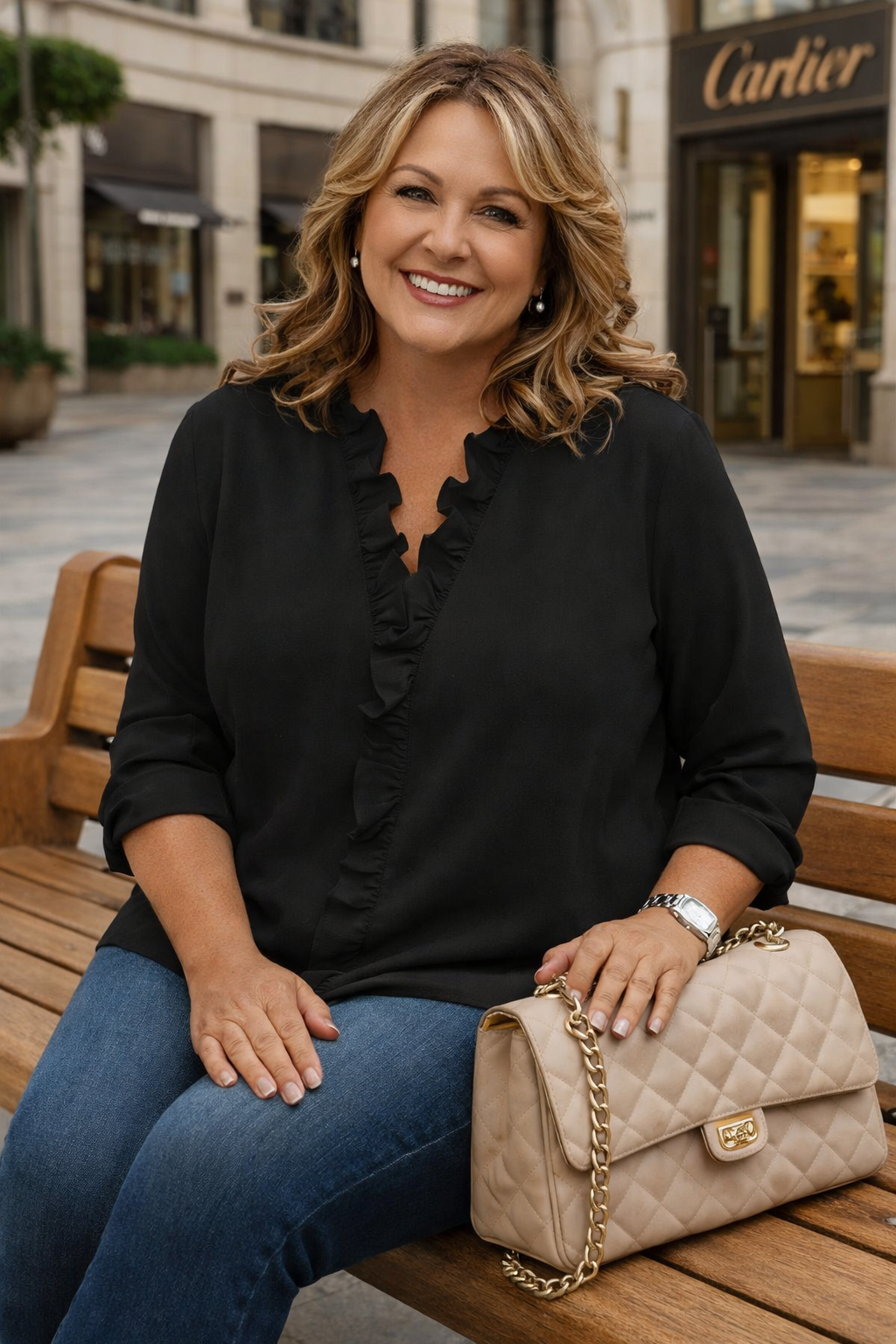 Eine mühelos raffinierte Bluse mit gerüschtem Ausschnitt und klaren Manschetten für eine elegante Silhouette!