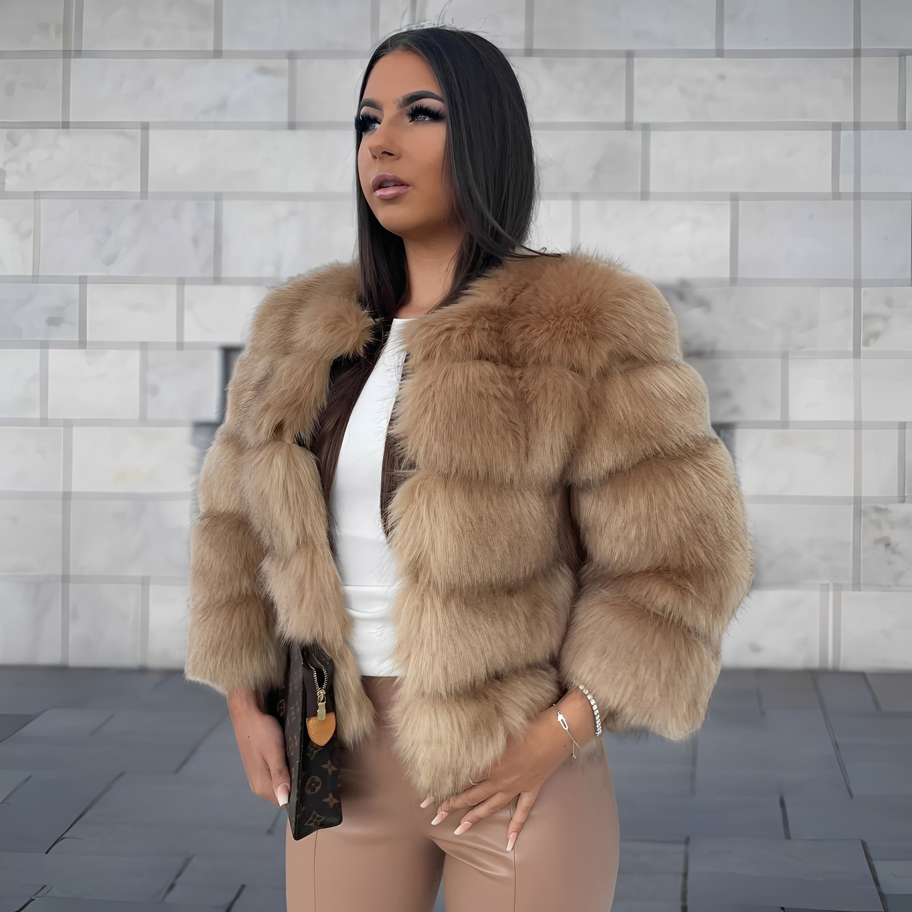 Der Kunstpelz fühlt sich weich an und legt sich angenehm um den Körper. Die klar gegliederten Partien verleihen Struktur, ohne die Silhouette zu überladen. Ob im Alltag oder zu besonderen Momenten – dieser Mantel ergänzt unterschiedliche Looks mit selbstverständlicher Präsenz.